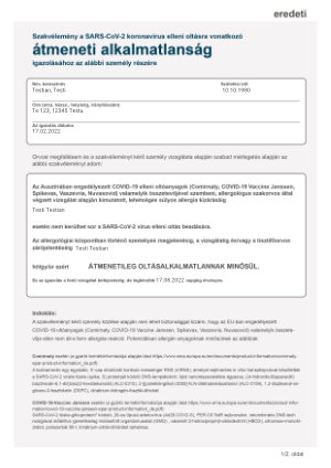 Az oltásalkalmatlansági igazolás legfeljebb 6 hónapig érvényes, ezután felváltható az allergológus szakorvos által kiállított oltásalkalmatlansági igazolással, aki a tesztelés után az allergiá(i)dra vonatkozó diagnózissal tudja alátámasztani azt.