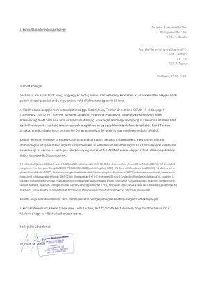 Az egyes hatóanyagokra való, már ismert vagy nem ismert allergiákat (pl. a már beadott oltások után jelentkező erősődő panaszokat) vizsgáló kérdőív kitöltése után egy orvosi szakvéleményben javasoljuk egy szakorvos (allergológus) bevonását. A teljeskörű szakorvosi vizsgálat időpontjáig egy oltásalkalmatlansági igazolást kapsz tőlünk. Ezen kívül kapsz egy beutalót az általad választott allergológushoz, melyben pontosan leírjuk, hogy a szakorvosnak milyen allergiákat szükséges vizsgálnia. Ő egy speciális allergia diagnosztika keretében célzottan vizsgálhatja, hogy a tested reagál-e az oltóanyagra, és ha igen, hogyan. . Az oltóanyagminta egyszerű bőrre csepegtetése a Biontech Comirnaty oltóanyag esetben nem kivitelezhető: maga a gyártó NEM javasolja, hogy az oltóanyag érintkezzen a bőrrel és ezzel kapcsolatban biztonsági tudnivalókat sorol fel. Ebben az esetben az allergológusnak másként kell eljárnia, pl. vért kell vennie és a laborban egy ún. bazofil aktivációs tesztet (BAT) kell végeznie.